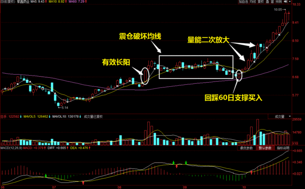 然后多方发力以一条穿越5、10、20的小幅放量的中阳摆脱池底之后回落20日均线的买点,往往会成为中级行情的最后低吸点。